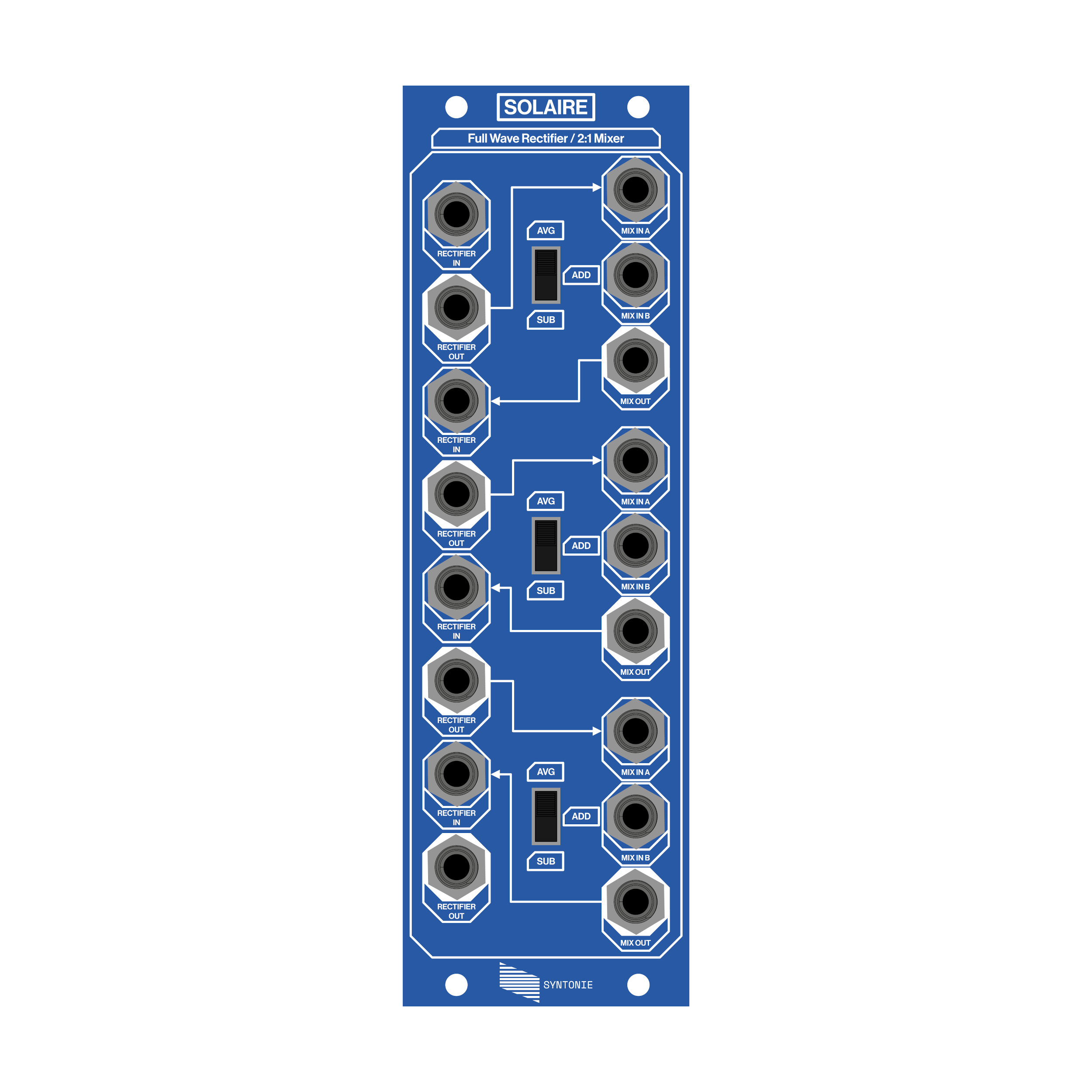 Le module comprend quatre redresseurs et trois mélangeurs 2:1 pour combiner deux signaux ou additionner un signal avec un signal LFO afin de moduler le décalage. Ces mélangeurs fonctionnent en mode moyenne, addition ou soustraction pour vos signaux. L’architecture des redresseurs et des mélangeurs de Solaire est normalisée. Ils peuvent être utilisés individuellement, ce qui augmente considérablement la flexibilité. À chaque étape, vous pouvez insérer un signal et rompre la normalisation, que ce soit pour générer des formes et des teintes complexes ou pour une modulation lente et progressive.
